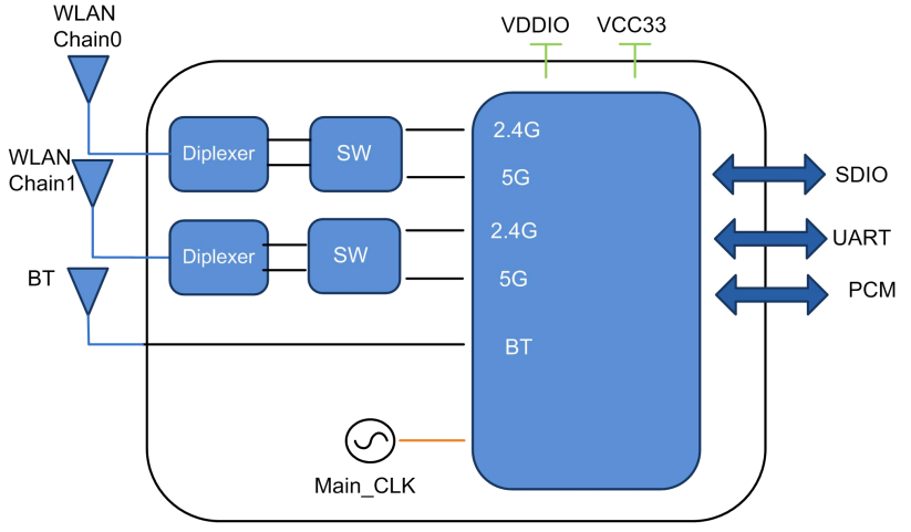 Prend en charge l'interface SDIO3.0 à basse puissance pour l'interface WLAN et UART / PCM pour