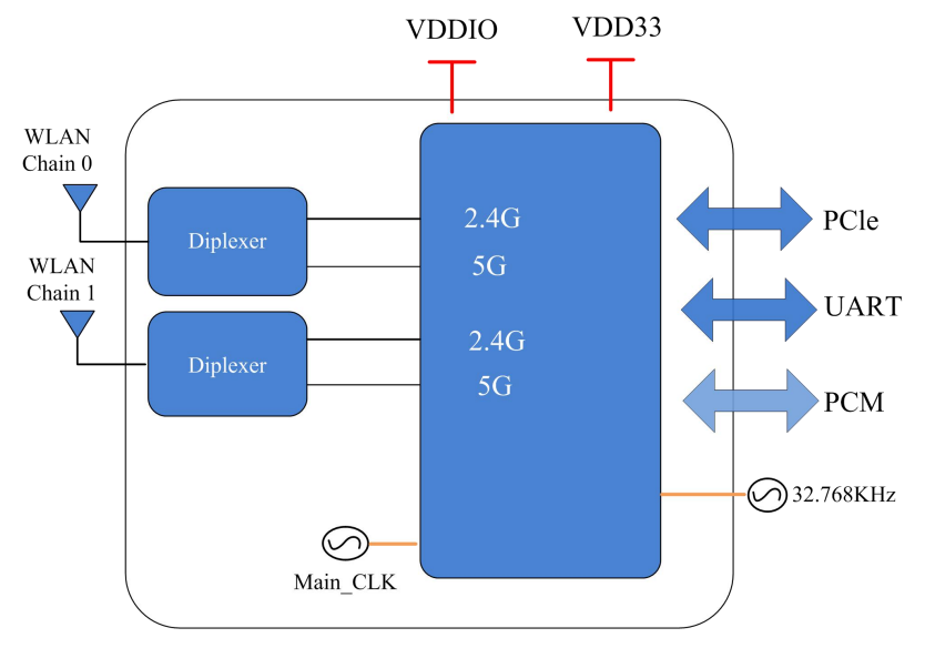 Prend en charge l'interface PCI-E à basse puissance pour l'interface WLAN et UART / PCM pour