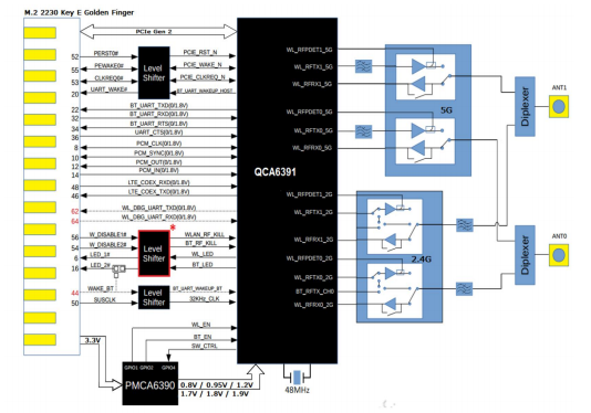 FG8291MPRX-00 | QCA6391 (QCA1064), clé M.2 2230 E, 2x2, 802.11A / B / G / N / AC / AX BT5.1DBS 2G & 5G |